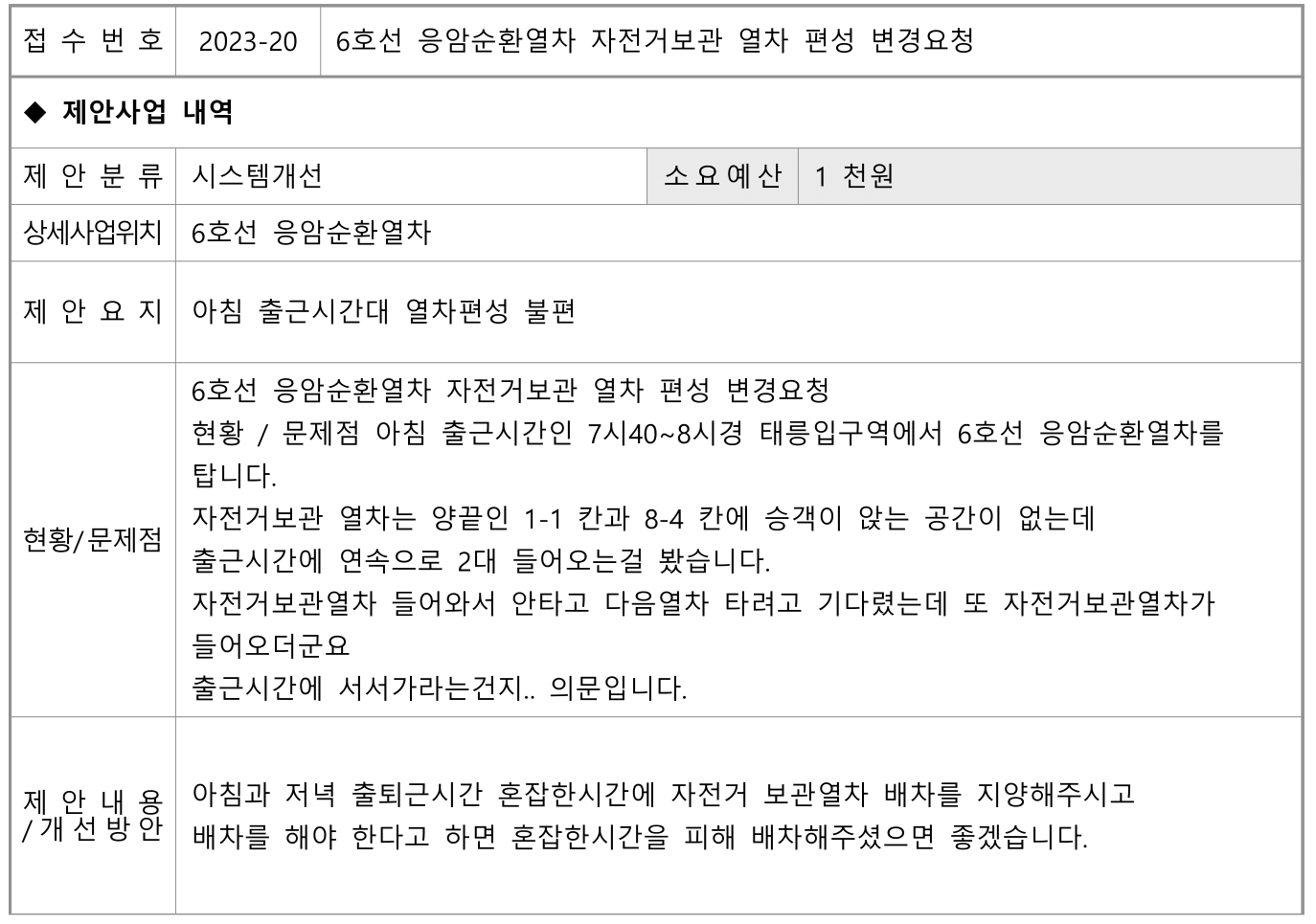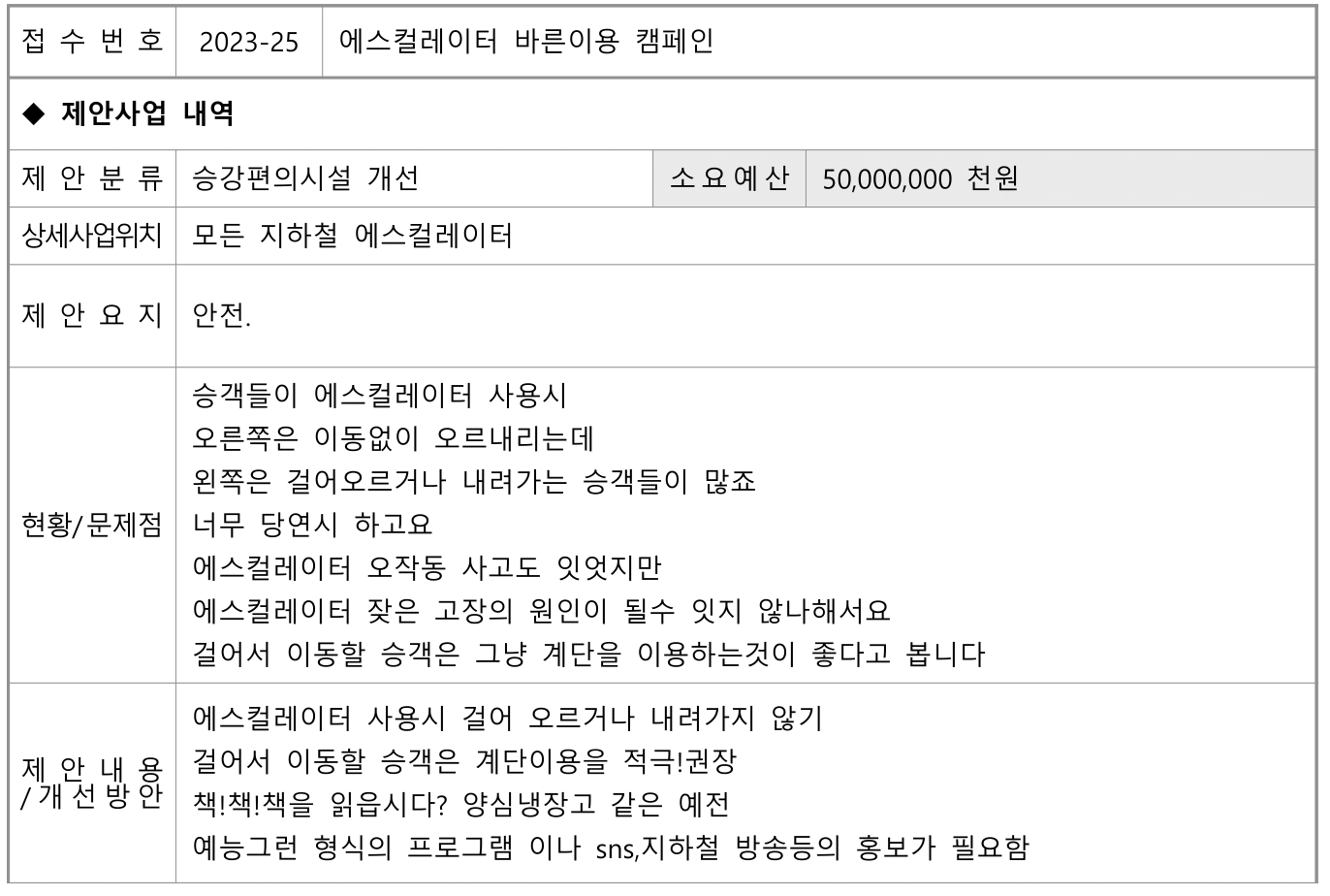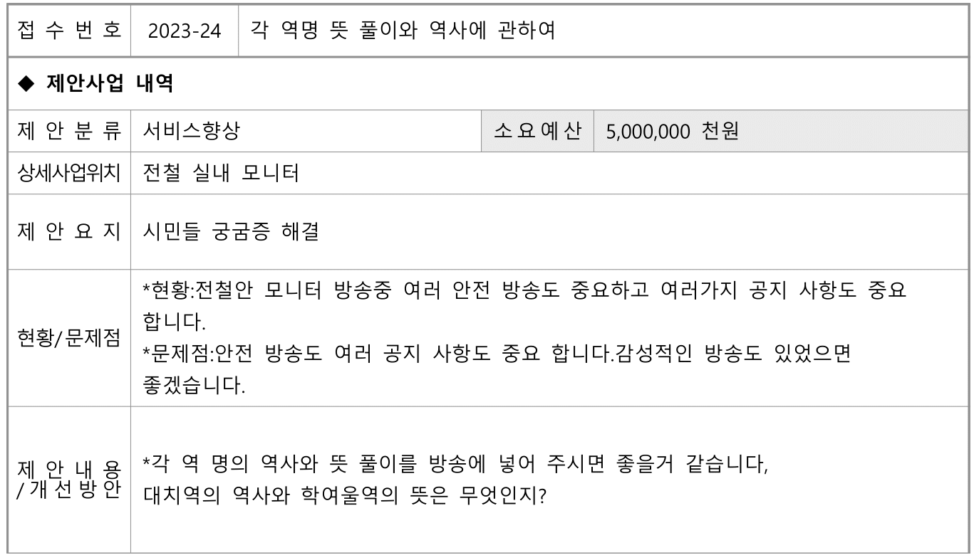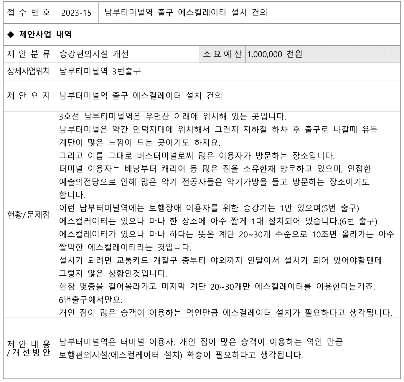 2024년 서울교통공사 주민참여예산 제안사업 선호도 조사 서울교통공사 예산처 담당자 (hyemin0130@seoulmetro.co.kr) Question Title * 1. 지하철을 이용하는 시민 여러분들께서 제안해주신 사업 내용입니다.공감되고 필요하다고 생각하시는 사업을 선택해주세요. (총 16개 사업 중 ★3개★ 선택) 1. 여행객 대상 단기권 도입 3. 스마트폰 앱을 통한 목적지 역 도착 알림 서비스 14. 보라매역 7호선 직통 탑승 게이트 신설 16. 광명사거리역 휠체어리프트 철거 11. 지상역 이동식 에어컨 설치 2. 에스컬레이터 안전사고 대처 시스템 개선 12. 강남역 승강장 LED 광고 부근 에어커튼 설치 8. 성신여대입구역 승강장 발빠짐 안전장치 설치 6. 장승배기역 5번출구 에스컬레이터 설치 7. 상일동역 4번 출구 화장실 신설 4. 대림역 4번출구 에스컬레이터 설치 13. 창동역 내부 계단 논슬립 설치 10. 교통카드 충전 및 구매 시 결제수단 다양화 9. 임산부 배려석 콜벨 설치 5. 승강장 행선안내게시기 미작동 기기 정상화 15. 서울역 내부 계단 캐리어 이동 슬라이딩 설치 Question Title * 2. 추첨을 통해 15분께 또타 인형을 선물로 배송해 드립니다.이벤트 추첨을 위한 참여자분의 정보 수집에 동의하십니까? 동의합니다. (아래 [3번]에서 이름, 주소 등 정보를 적어주세요) 동의하지 않습니다. (맨아래 [완료] 버튼을 눌러주세요) Question Title * 3. 추첨 및 경품 배송을 위해 참여자분의 정보를 적어주세요.개인정보는 추첨 직후 폐기됩니다. 이름 주소(경품 배송지) 이메일 주소 핸드폰번호 Question Title 완료